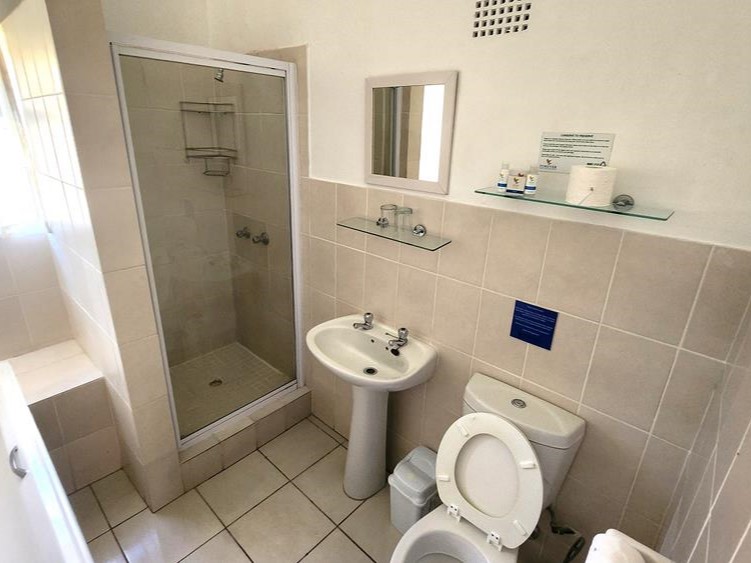 Three Bedroom Chalet. Main Bedroom with single beds. Second and third Bedrooms have one bunk bed in each Bedroom. Open plan Living-room and kitchen: stove, fridge, microwave, DSTV (selection of channels). Bathroom with wheelchair accessible shower and toilet (no bath). Patio area with braai. Open parking. Maximum 6 Persons.