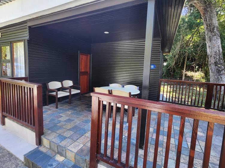3-bedroom chalet. Main Bedroom has two single beds. Second and third Bedrooms have one bunk bed in each bedroom. Open plan living-room with Kitchen: stove, fridge, microwave, DSTV (selection of channels). Bathroom with bath, shower and toilet. Patio are with braai. Open parking. Maximum 6 Persons